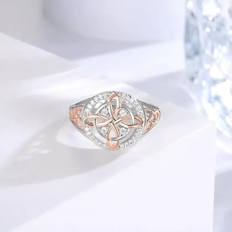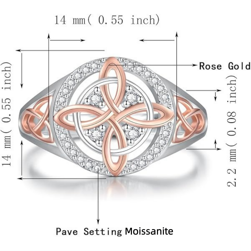 Centered on "Celtic knot + two-tone contrast + diamond-studded". this ring is made of sterling silver + moissanite craft. integrating Celtic ethnic symbols with light luxury shiny texture. It is a unisex iconic accessory for light retro and daily outfits.The ring surface is a classic Celtic knot symbolizing eternal connection. adopting silver + rose gold two-tone contrast design enhancing layers and delicacy. the outer ring is fully studded with moissanite high-gloss cut. shiny without being ostentatious;The sterling silver base is hypoallergenic and non-oxidizing. the two-tone plating color is long-lasting. multiple sizes are available . balancing ethnic cultural attributes and long-term wearing practicality.